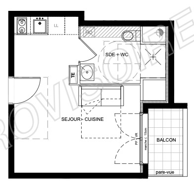 Il comprend un séjour et cuisine ouverte, une salle d’eau avec WC.