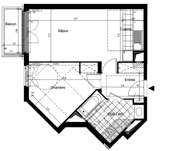 Il comprend, une entrée, un séjour avec cuisine ouverte de 21,54 m², un balcon de 2,94 m², 1 chambres de 11,77 m², une SDB avec WC.